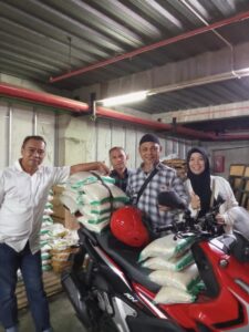 Dengan penuh semangat, tim relawan mengangkut beras menggunakan motor.“Kami ini kerja ikhlas. Apalagi ini adalah amanah dari ketua kami,” kata Mursalim Thahir, salah seorang alumni yang jadi tim relawan.
