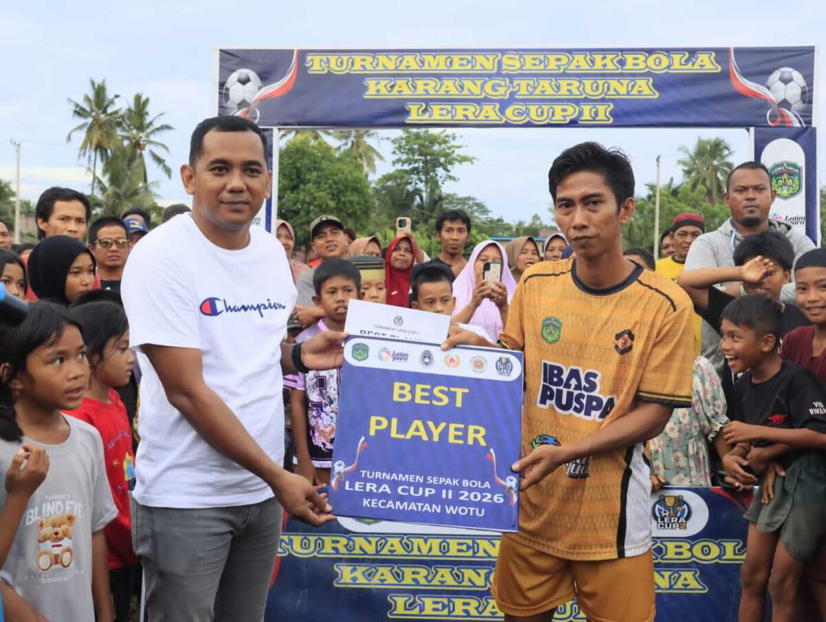 MALILI, BKM — Bupati Luwu Timur, Irwan Bachri Syam resmi menutup kompetisi turnamen Lera Cup II 2026 di Lapangan Desa Lera, Kecamatan Wotu, Sabtu (31/1). Irwan hadir sekaligus menyaksikan laga final yang mempertemukan antara Lera United melawan Benteng Utama. Di partai puncak, Lera United berhasil meraih kemenangan dengan skor 3-1 atas Benteng Utama. Lera United tamoil sebagai juara.